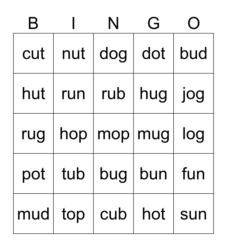 This bingo card has 25 words: tub, cub, rub, mud, bud, cut, hut, nut, mug, bug, hug, rug, bun, fun, run, sun, log, dog, jog, hop, mop, top, pot, dot and hot.