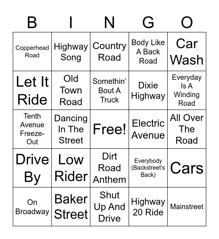 This bingo card has a free space and 70 words: 6th Avenue Heartache, All Over The Road, Back On The Road Again, Backroad Song, Baker Street, Bless The Broken Road, Body Like A Back Road, Bright Side Of The Road, Car Wash, Caravan, Cars, Convoy, Copperhead Road, Country Road, Crossroads, Dancing In The Street, Dirt Road Anthem, Dixie Highway, Drive, Drive By, Electric Avenue, Everybody (Backstreet’s Back), Everyday Is A Winding Road, She Drives Me Crazy, Freeway Of Love, Gasoline Alley, Goodbye Yellow Brick Road, Happy Trails, Highway 20 Ride, Highway 61, Highway Song, Highway Star, Hit The Road Jack, I Am The Highway, I Can’t Drive 55, I Drive Your Truck, Interstate Love Song, Joyride, King Of The Road, Let It Ride, Life Is A Highway, Low Rider, Mainstreet, Moon Over Bourbon Street, Nights On Broadway, Old Town Road, On Broadway, Overdrive, Ramblin’ Man, Ride, Ride All Night, Roadhouse Blues, Rockin’ Down The Highway, Seven Bridges Road, Shut Up And Drive, Sneakin’ Sally Through The Alley, Somethin’ Bout A Truck, Street Fighting Man, Streets, Take Me Home, Country Roads, Tenth Avenue Freeze-Out, The Road, Theme From Hill Street Blues, Truck Yeah, Truckin’, Two Lane Highway, Under The Boardwalk, Ventura Highway, We Ride and We Rode In Trucks.