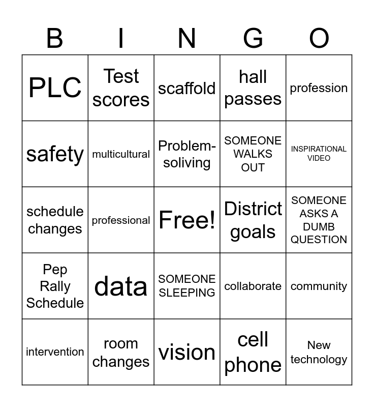 This bingo card has a free space and 25 words: data, vision, Problem-soliving, intervention, profession, PLC, safety, Test scores, District goals, SOMEONE SLEEPING, SOMEONE WALKS OUT, schedule changes, collaborate, community, multicultural, POP CULTURE REFERENCE, SOMEONE ASKS A DUMB QUESTION, scaffold, INSPIRATIONAL VIDEO, professional, New technology, room changes, Pep Rally Schedule, hall passes and cell phone.