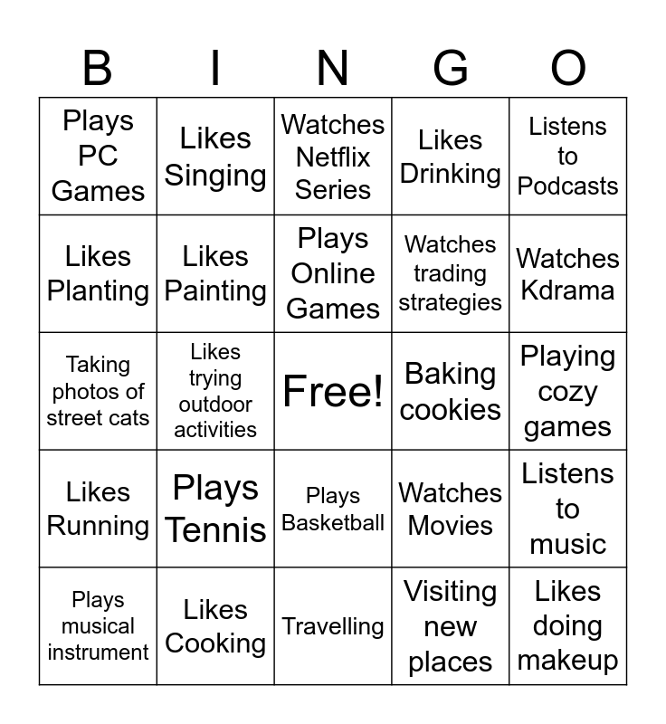 This bingo card has a free space and 24 words: Plays Tennis, Likes Cooking, Plays Online Games, Plays musical instrument, Listens to Podcasts, Plays PC Games, Likes Planting, Likes Singing, Baking cookies, Plays Basketball, Watches trading strategies, Taking photos of street cats, Watches Movies, Listens to music, Likes Painting, Visiting new places, Playing cozy games, Watches Netflix Series, Watches Kdrama, Likes trying outdoor activities, Likes doing makeup, Likes Running, Likes Drinking and Travelling.