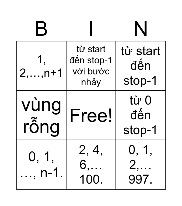 This bingo card has a free space and 8 words: từ 0 đến stop-1, từ start đến stop-1, từ start đến stop-1 với bước nhảy, 0, 1, …, n-1., 1, 2,…,n+1, 0, 1, 2,…997., vùng rỗng and 2, 4, 6,…100..