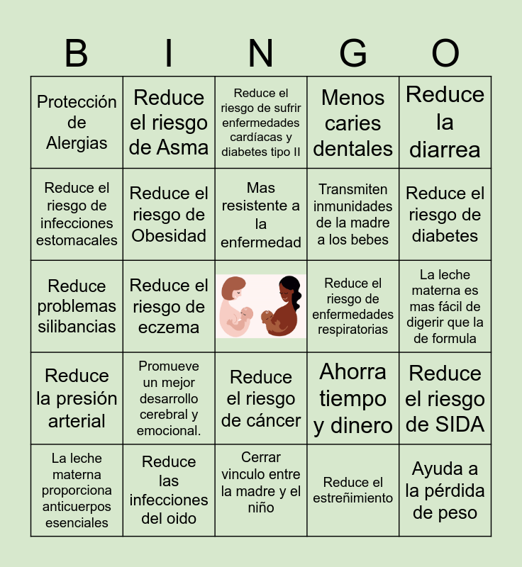 This bingo card has a free space and 24 words: Promueve un mejor desarrollo cerebral y emocional., Reduce las infecciones del oido, Mas resistente a la enfermedad, La leche materna proporciona anticuerpos esenciales, Reduce la diarrea, Protección de Alergias, Reduce el riesgo de infecciones estomacales, Reduce el riesgo de Asma, Reduce el riesgo de enfermedades respiratorias, Reduce el riesgo de cáncer, Transmiten inmunidades de la madre a los bebes, Reduce problemas silibancias, Ahorra tiempo y dinero, Reduce el riesgo de SIDA, Reduce el riesgo de Obesidad, Reduce el estreñimiento, La leche materna es mas fácil de digerir que la de formula, Reduce el riesgo de sufrir enfermedades cardíacas y diabetes tipo II, Reduce el riesgo de diabetes, Reduce el riesgo de eczema, Ayuda a la pérdida de peso, Reduce la presión arterial, Menos caries dentales and Cerrar vinculo entre la madre y el niño.