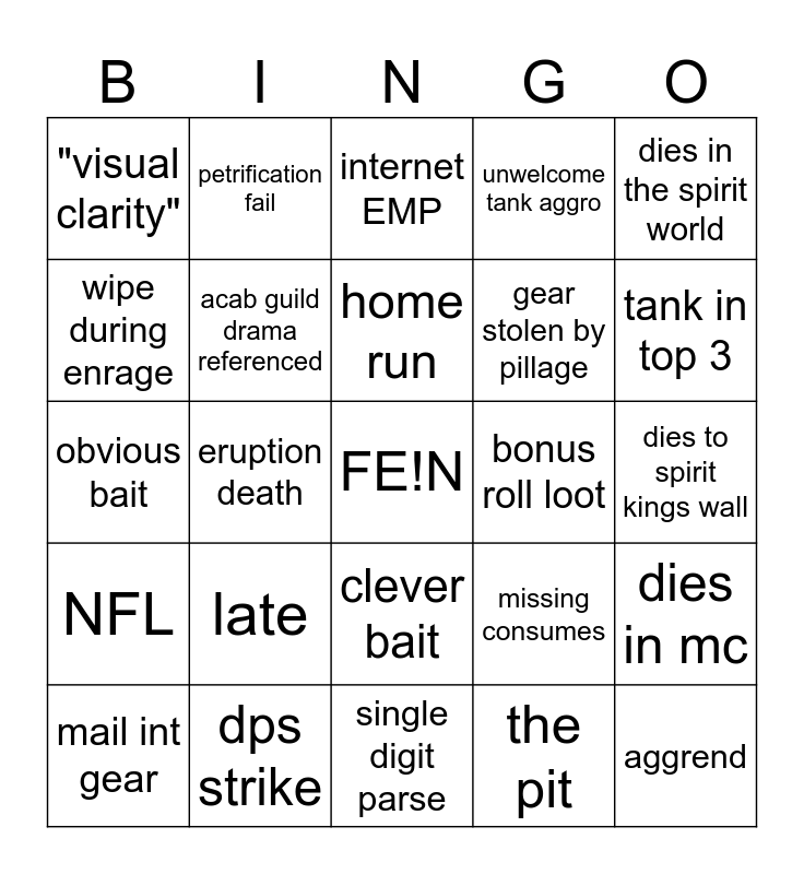 This bingo card has a free space and 32 words: the pit, >=5 people stunned by arrows, eruption death, YFL, NFL, acab guild drama referenced, dies in the spirit world, dies in mc, petrification fail, whiff null barrier, home run, internet EMP, batrider moment, trash wipe, bonus roll loot, frontal, mail int gear, obvious bait, clever bait, late, missing consumes, 10mg, dies to spirit kings wall, dps strike, aggrend, unwelcome tank aggro, gear stolen by pillage, wipe during enrage, "visual clarity", single digit parse, 99+ parse and tank in top 3.