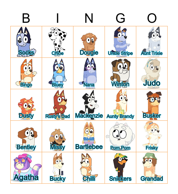 This bingo card has 47 images, a free space and 47 words: Bandit, Grandad, Uncle Rad, Chilli, Missy, Muffin, Chloe, Floppy, Bingo, Coco, Bluey, Uncle Stripe, Frisky, Pom Pom, Honey, Indy, Nana, Aunty Brandy, Lucky, Aunt Trixie, Rusty's Dad, Snickers, Socks, Winton, Unicorse, Judo, Agatha, Alfie, Bartlebee, Bentley, Bob Bilby, Bobo, Browny Bear, Buddy, Burger Dog, Bucky, Busker, Calypso, Chattermax, Chucky, Doreen, Dougie, Dusty, Fido, Flappy, Chippy and Sparky.
