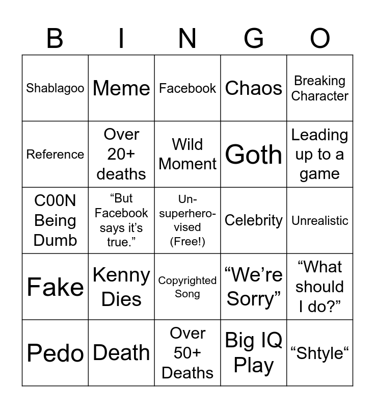 This bingo card has a free space and 24 words: Kenny Dies, Death, Wild Moment, Pedo, Breaking Character, Shablagoo, Reference, Meme, Celebrity, Copyrighted Song, Goth, C00N Being Dumb, “We’re Sorry”, “What should I do?”, Over 20+ deaths, Big IQ Play, Unrealistic, Facebook, Leading up to a game, “But Facebook says it’s true.”, “Shtyle“, Fake, Chaos and Over 50+ Deaths.