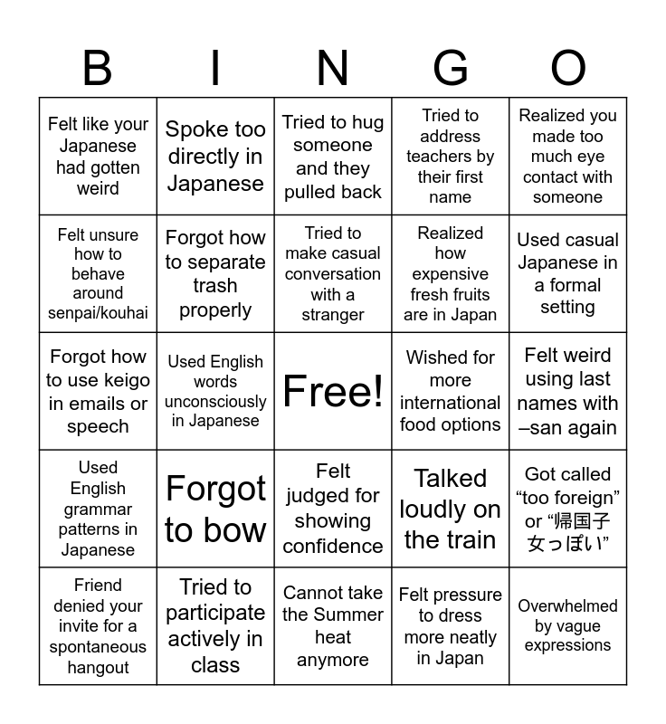 This bingo card has a free space and 24 words: Forgot to bow, Tried to participate actively in class, Tried to make casual conversation with a stranger, Friend denied your invite for a spontaneous hangout, Realized you made too much eye contact with someone, Felt like your Japanese had gotten weird, Felt unsure how to behave around senpai/kouhai, Spoke too directly in Japanese, Wished for more international food options, Felt judged for showing confidence, Realized how expensive fresh fruits are in Japan, Forgot how to use keigo in emails or speech, Talked loudly on the train, Got called “too foreign” or “帰国子女っぽい”, Forgot how to separate trash properly, Felt pressure to dress more neatly in Japan, Felt weird using last names with –san again, Tried to hug someone and they pulled back, Used casual Japanese in a formal setting, Used English words unconsciously in Japanese, Overwhelmed by vague expressions, Used English grammar patterns in Japanese, Tried to address teachers by their first name and Cannot take the Summer heat anymore.