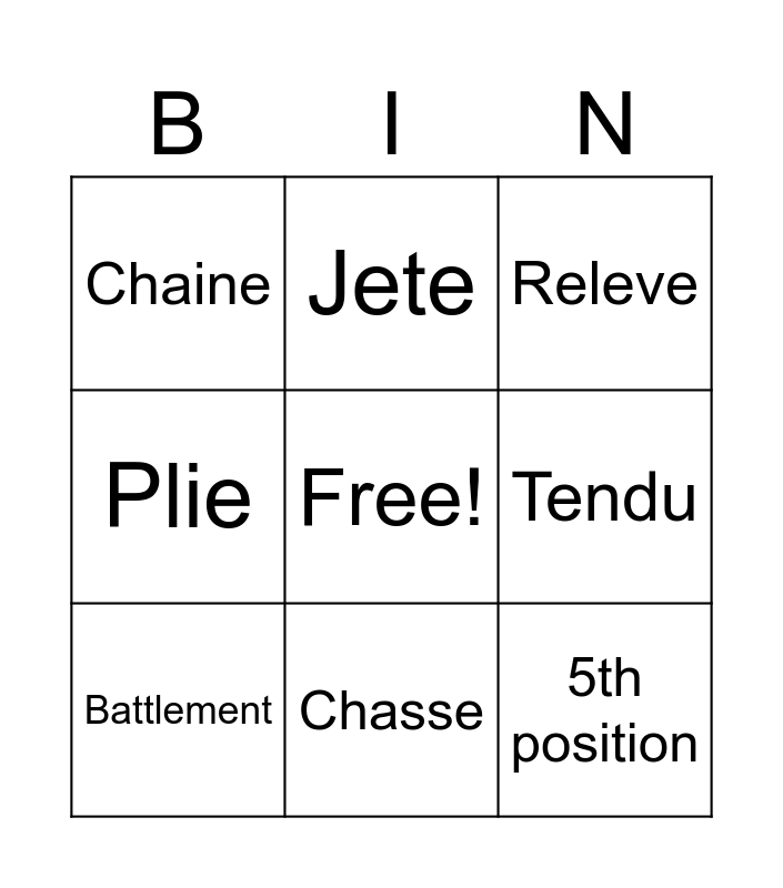 This bingo card has a free space and 8 words: Plie, Jete, Tendu, Battlement, Releve, Chaine, Chasse and 5th position.