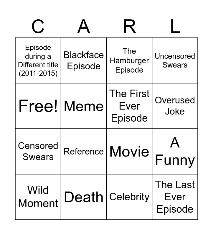 This bingo card has 17 words: Wild Moment, Death, The Hamburger Episode, Uncensored Swears, Censored Swears, Meme, Movie, Overused Joke, Free!, Reference, Celebrity, A Funny, Episode during a Different title (2011-2015), Blackface Episode, The First Ever Episode, The Last Ever Episode and One of the main characters die.