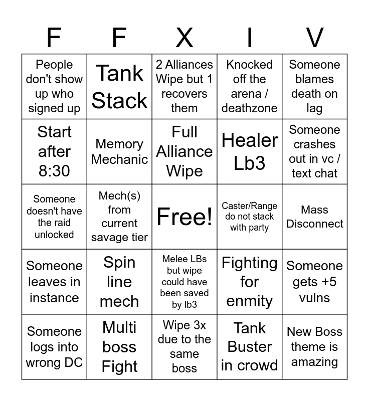 This bingo card has a free space and 24 words: Someone logs into wrong DC, Spin line mech, Full Alliance Wipe, Tank Buster in crowd, Someone blames death on lag, People don't show up who signed up, Tank Stack, 2 Alliances Wipe but 1 recovers them, Caster/Range do not stack with party, Mass Disconnect, Someone doesn't have the raid unlocked, Memory Mechanic, Fighting for enmity, Someone gets +5 vulns, Start after 8:30, Multi boss Fight, Wipe 3x due to the same boss, Knocked off the arena / deathzone, Someone crashes out in vc / text chat, Someone leaves in instance, Mech(s) from current savage tier, Melee LBs but wipe could have been saved by lb3, Healer Lb3 and New Boss theme is amazing.