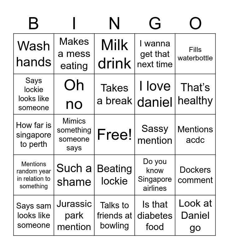 This bingo card has a free space and 24 words: Such a shame, Jurassic park mention, Takes a break, Says sam looks like someone, Fills waterbottle, Wash hands, Says lockie looks like someone, Makes a mess eating, Sassy mention, Beating lockie, I love daniel, How far is singapore to perth, Do you know Singapore airlines, Dockers comment, Oh no, Is that diabetes food, Mentions acdc, Milk drink, That’s healthy, Mimics something someone says, Look at Daniel go, Mentions random year in relation to something, I wanna get that next time and Talks to friends at bowling.