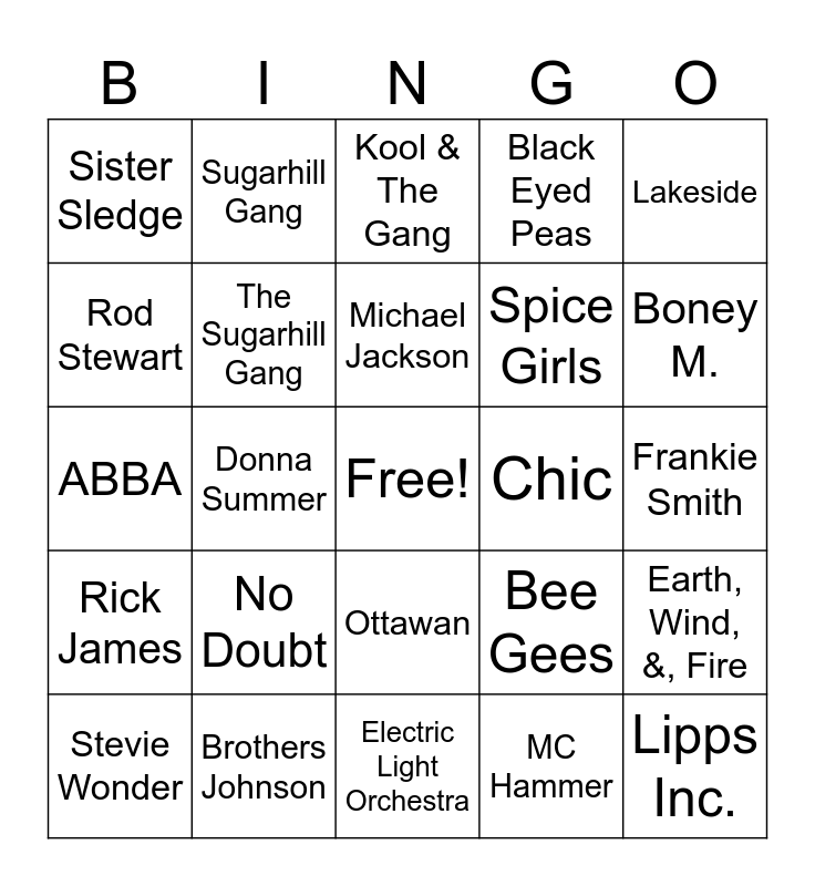 This bingo card has a free space and 25 words: No Doubt, Electric Light Orchestra, Michael Jackson, Stevie Wonder, Lakeside, Sister Sledge, Rod Stewart, Sugarhill Gang, Chic, Ottawan, Spice Girls, ABBA, Bee Gees, Earth, Wind, &, Fire, The Sugarhill Gang, A Taste Of Honey, Frankie Smith, Kool & The Gang, Boney M., Donna Summer, Lipps Inc., Brothers Johnson, Rick James, Black Eyed Peas and MC Hammer.
