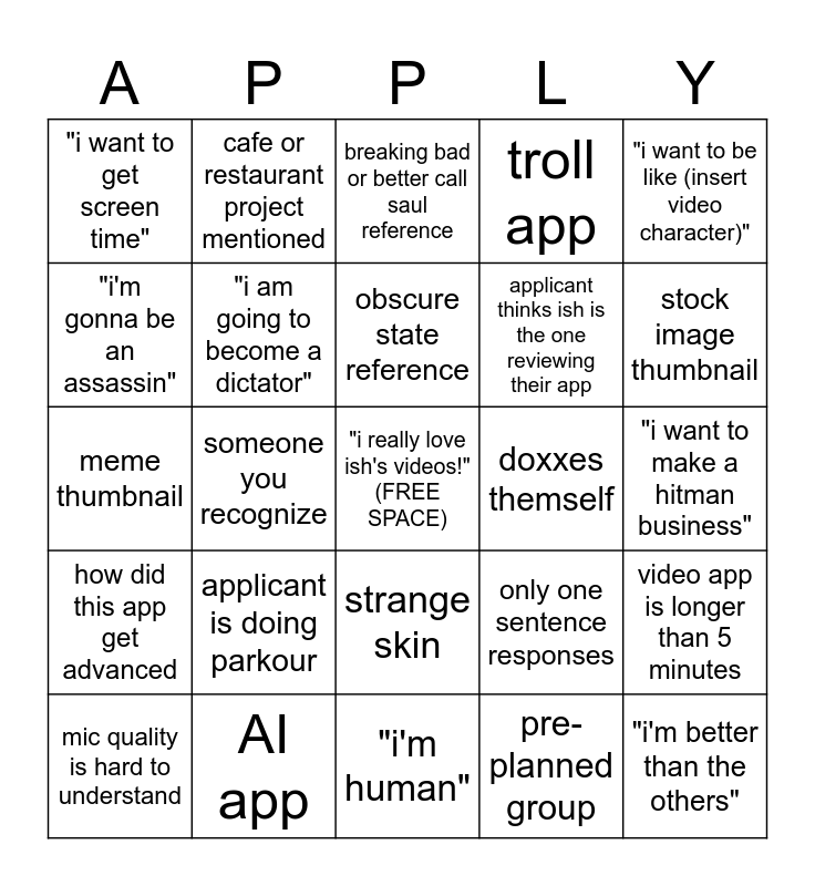 This bingo card has a free space and 39 words: cool build in the background, "i plan to win the event", definitely going to break some rules if they get in, only one sentence responses, video app is longer than 5 minutes, how did this app get advanced, someone you recognize, "i will make a cult about (insert random thing)", doxxes themself, "i want to make a hitman business", "i'm gonna be an assassin", cafe or restaurant project mentioned, the app is written like a manifesto, stock image thumbnail, meme thumbnail, applicant is doing parkour, strange skin, troll app, incredible background music, mic quality is hard to understand, "i am going to become a dictator", obscure state reference, pre-planned group, "i want to be like (insert video character)", genuinely creative and entertaining app, AI app, "i'm human", "i'm going to create a mafia", emojis are used in app, "i want to get screen time", "i'm a pvper", among us reference in 2025, applicant thinks ish is the one reviewing their app, "i'm better than the others", "my goal is world domination", applicant has a unique skill they show off, breaking bad or better call saul reference, application is less than a minute long and strange username.