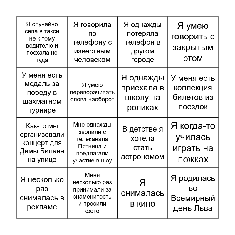 This bingo card has 16 words: Меня несколько раз принимали за знаменитость и просили фото, Я когда-то училась играть на ложках, Я однажды потеряла телефон в другом городе, Я случайно села в такси не к тому водителю и поехала не туда, Как-то мы организовали концерт для Димы Билана на улице, Я говорила по телефону с известным человеком, В детстве я хотела стать астрономом, Я снималась в кино, У меня есть медаль за победу в шахматном турнире, Я умею переворачивать слова наоборот, Я несколько раз снималась в рекламе, Я умею говорить с закрытым ртом, Мне однажды звонили с телеканала Пятница и предлагали участие в шоу, У меня есть коллекция билетов из поездок, Я однажды приехала в школу на роликах and Я родилась во Всемирный день Льва.