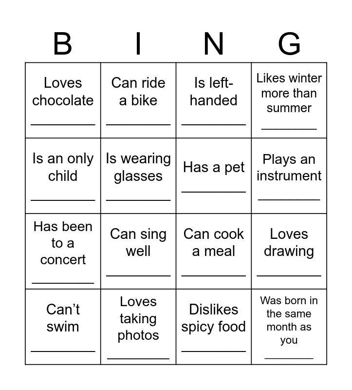 This bingo card has 16 words: Loves taking photos ________, Loves drawing ________, Is left-handed ________, Loves chocolate ________, Has been to a concert ________, Can ride a bike ________, Can cook a meal ________, Dislikes spicy food ________, Is an only child ________, Is wearing glasses ________, Can’t swim ________, Likes winter more than summer ________, Can sing well ________, Plays an instrument ________, Has a pet ________ and Was born in the same month as you ________.
