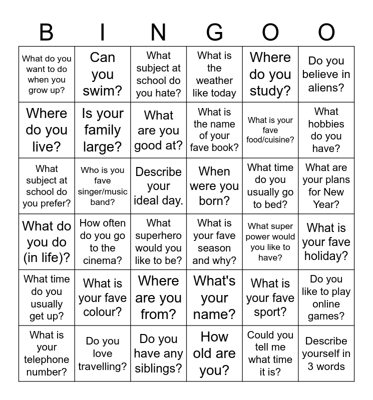 This bingo card has 36 words: What's your name?, Where are you from?, How old are you?, Where do you live?, What do you do (in life)?, When were you born?, Is your family large?, Do you have any siblings?, Where do you study?, What is your fave sport?, What hobbies do you have?, What is the weather like today, Do you like to play online games?, Who is you fave singer/music band?, What is the name of your fave book?, What do you want to do when you grow up?, What time do you usually get up?, What time do you usually go to bed?, What subject at school do you prefer?, What subject at school do you hate?, Describe your ideal day., How often do you go to the cinema?, What is your fave season and why?, What superhero would you like to be?, What super power would you like to have?, Can you swim?, What is your fave food/cuisine?, Do you love travelling?, What are you good at?, Do you believe in aliens?, Describe yourself in 3 words, What is your telephone number?, What is your fave holiday?, What are your plans for New Year?, What is your fave colour? and Could you tell me what time it is?.