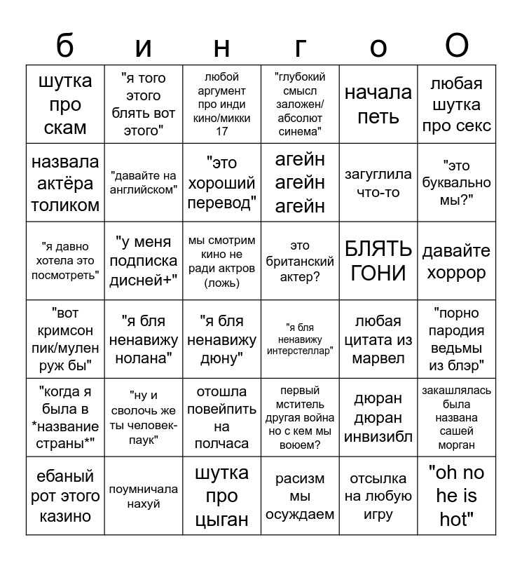 This bingo card has 36 words: первый мститель другая война но с кем мы воюем?, отошла повейпить на полчаса, расизм мы осуждаем, назвала актёра толиком, "вот кримсон пик/мулен руж бы", это британский актер?, "давайте на английском", шутка про цыган, начала петь, дюран дюран инвизибл, "это буквально мы?", "глубокий смысл заложен/абсолют синема", закашлялась была названа сашей морган, "у меня подписка дисней+", агейн агейн агейн, шутка про скам, "когда я была в *название страны*", БЛЯТЬ ГОНИ, "я давно хотела это посмотреть", любой аргумент про инди кино/микки 17, мы смотрим кино не ради актров (ложь), "я бля ненавижу нолана", "я бля ненавижу интерстеллар", "я бля ненавижу дюну", любая цитата из марвел, "я того этого блять вот этого", загуглила что-то, поумничала нахуй, "это хороший перевод", любая шутка про секс, "oh no he is hot", ебаный рот этого казино, "порно пародия ведьмы из блэр", давайте хоррор, "ну и сволочь же ты человек-паук" and отсылка на любую игру.