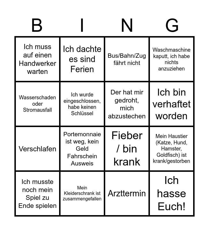 This bingo card has 16 words: Mein Kleiderschrank ist zusammengefallen, Mein Haustier (Katze, Hund, Hamster, Goldfisch) ist krank/gestorben, Bus/Bahn/Zug fährt nicht, Ich muss auf einen Handwerker warten, Verschlafen, Ich dachte es sind Ferien, Fieber / bin krank, Arzttermin, Wasserschaden oder Stromausfall, Ich wurde eingeschlossen, habe keinen Schlüssel, Ich musste noch mein Spiel zu Ende spielen, Waschmaschine kaputt, ich habe nichts anzuziehen, Portemonnaie ist weg, kein Geld Fahrschein Ausweis, Ich bin verhaftet worden, Der hat mir gedroht, mich abzustechen and Ich hasse Euch!.
