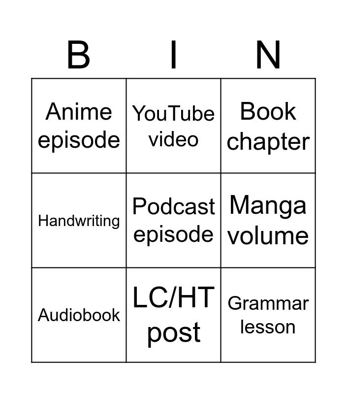 This bingo card has a free space and 8 words: Manga volume, Book chapter, YouTube video, Audiobook, Anime episode, Grammar lesson, Handwriting and LC/HT post.
