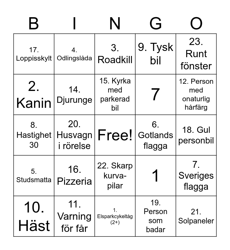 This bingo card has a free space and 27 words: 1, 3, 7, 1. Elsparkcykeltåg (2+), 2. Kanin, 3. Roadkill, 4. Odlingslåda, 5. Studsmatta, 6. Gotlands flagga, 7. Sveriges flagga, 8. Hastighet 30, 9. Tysk bil, 10. Häst, 11. Varning för får, 12. Person med onaturlig hårfärg, 13. Person som äter, 14. Djurunge, 15. Kyrka med parkerad bil, 16. Pizzeria, 17. Loppisskylt, 18. Gul personbil, 19. Person som badar, 20. Husvagn i rörelse, 21. Solpaneler, 22. Skarp kurva-pilar, 23. Runt fönster and 24. Motorcykel/mobil.
