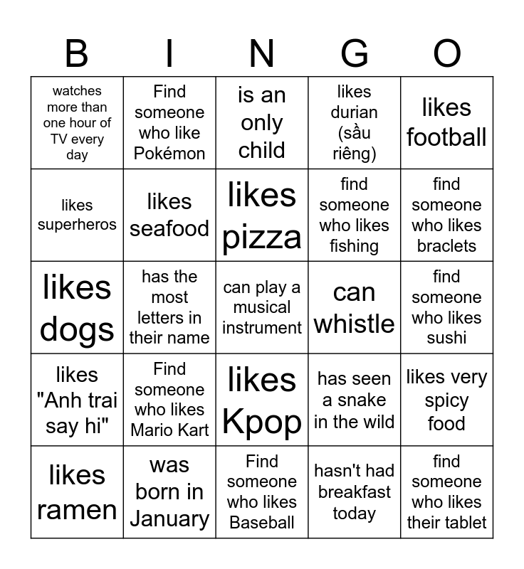 This bingo card has 35 words: likes basketball, likes cats, likes movies, likes seafood, likes Kpop, likes durian (sầu riêng), likes superheros, has had stitches, likes pizza, likes video games, likes dogs, likes football, bites his/her fingernails, likes playing chess, watches more than one hour of TV every day, can whistle, hasn't had breakfast today, has the most letters in their name, likes "Anh trai say hi", can play a musical instrument, has seen a snake in the wild, likes ramen, likes very spicy food, was born in January, is an only child, find someone who likes braclets, find someone who likes their tablet, find someone who likes roblox, find someone who likes fishing, find someone who likes sushi, Find someone who plays an instrument, Find someone who likes Baseball, Find someone who likes Mario Kart, Find someone who like Pokémon and Find someone who can cook.