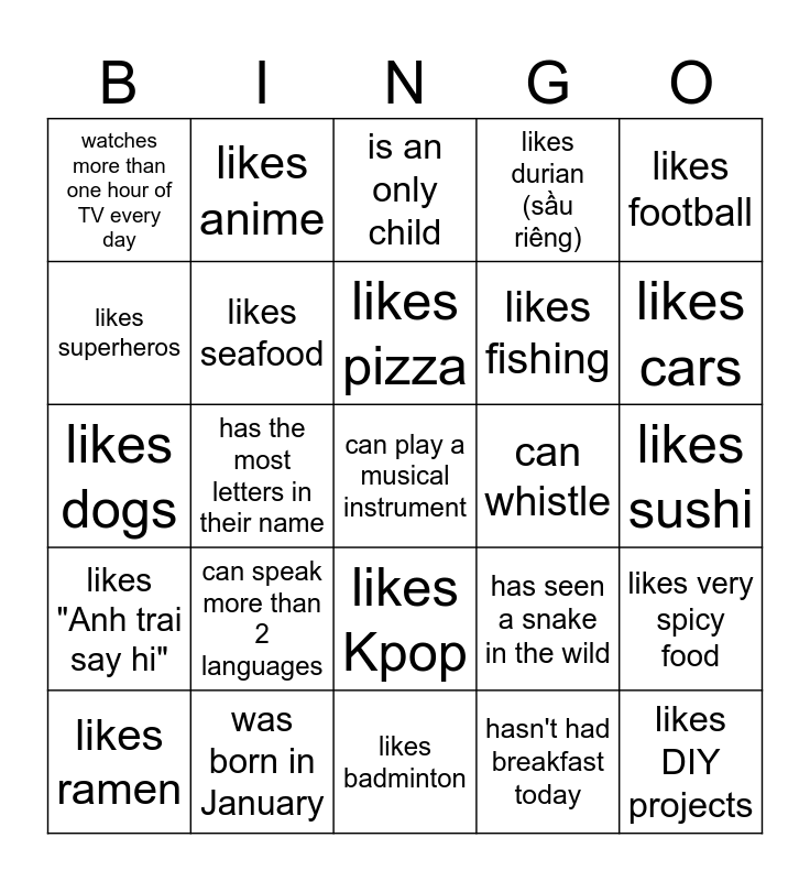 This bingo card has 35 words: likes basketball, likes cats, likes movies, likes seafood, likes Kpop, likes durian (sầu riêng), likes superheros, has had stitches, likes pizza, likes video games, likes dogs, likes football, bites his/her fingernails, likes playing chess, watches more than one hour of TV every day, can whistle, hasn't had breakfast today, has the most letters in their name, likes "Anh trai say hi", can play a musical instrument, has seen a snake in the wild, likes ramen, likes very spicy food, was born in January, is an only child, likes cars, likes DIY projects, likes roblox, likes fishing, likes sushi, plays drums, likes badminton, can speak more than 2 languages, likes anime and can swim.