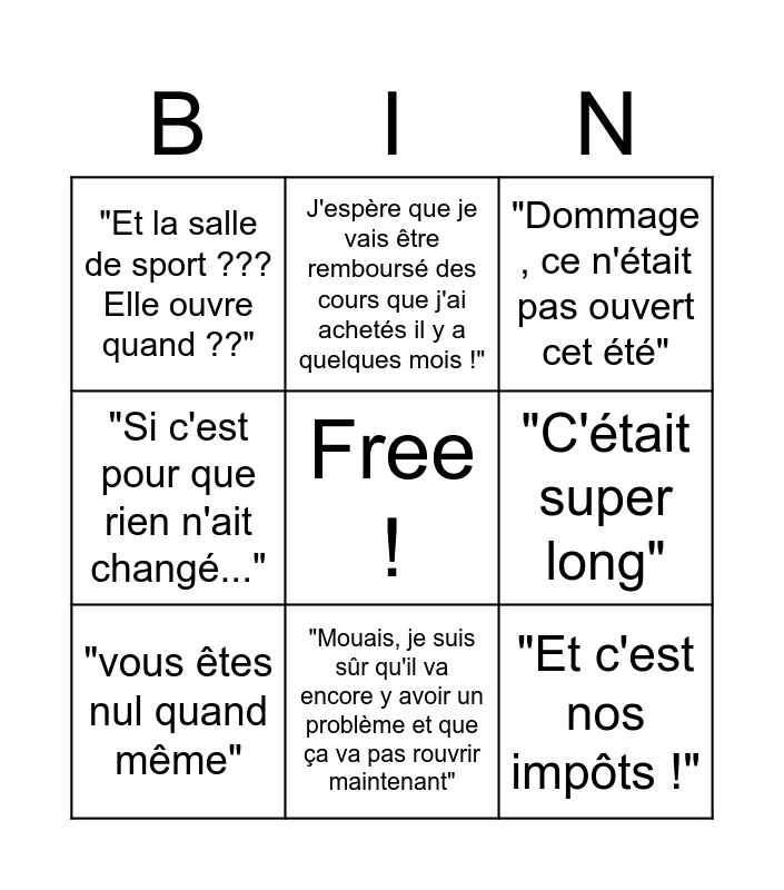 This bingo card has a free space and 8 words: "C'était super long", "Dommage , ce n'était pas ouvert cet été", J'espère que je vais être remboursé des cours que j'ai achetés il y a quelques mois !", "vous êtes nul quand même", "Et la salle de sport ??? Elle ouvre quand ??", "Et c'est nos impôts !", "Si c'est pour que rien n'ait changé..." and "Mouais, je suis sûr qu'il va encore y avoir un problème et que ça va pas rouvrir maintenant".