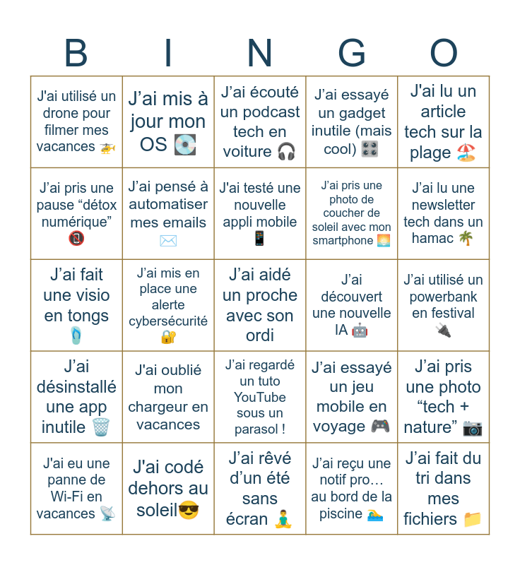 This bingo card has a free space and 24 words: J'ai oublié mon chargeur en vacances, J'ai codé dehors au soleil😎, J'ai testé une nouvelle appli mobile 📱, J'ai eu une panne de Wi-Fi en vacances 📡, J'ai lu un article tech sur la plage 🏖️, J'ai utilisé un drone pour filmer mes vacances 🚁, J’ai pris une pause “détox numérique” 📵, J’ai mis à jour mon OS 💽, J’ai découvert une nouvelle IA 🤖, J’ai regardé un tuto YouTube sous un parasol !, J’ai pris une photo de coucher de soleil avec mon smartphone 🌅, J’ai fait une visio en tongs 🩴, J’ai essayé un jeu mobile en voyage 🎮, J’ai pris une photo “tech + nature” 📷, J’ai pensé à automatiser mes emails ✉️, J’ai reçu une notif pro… au bord de la piscine 🏊♂️, J’ai utilisé un powerbank en festival 🔌, J’ai écouté un podcast tech en voiture 🎧, J’ai lu une newsletter tech dans un hamac 🌴, J’ai mis en place une alerte cybersécurité 🔐, J’ai fait du tri dans mes fichiers 📁, J’ai désinstallé une app inutile 🗑️, J’ai essayé un gadget inutile (mais cool) 🎛️ and J’ai rêvé d’un été sans écran 🧘♂️.