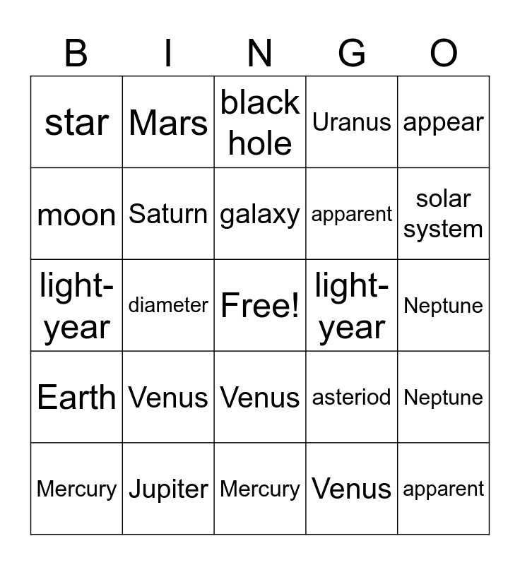 ⚠ This card has duplicate items: star (2), apparent (2), solar system (3), Mercury (2), Venus (4), Earth (2), Mars (2), orbit (3), moon (2), Jupiter (2), Saturn (3), Uranus (2), Neptune (2), asteriod (2), comet (2), perceive (2), galaxy (3), light-year (2), black hole (2), appear (2), diameter (3)