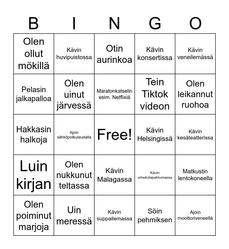 This bingo card has a free space and 24 words: Olen nukkunut teltassa, Uin meressä, Maratonkatselin esim. Netflixiä, Olen poiminut marjoja, Kävin veneilemässä, Olen ollut mökillä, Pelasin jalkapalloa, Kävin huvipuistossa, Kävin Helsingissä, Kävin Malagassa, Tein Tiktok videon, Hakkasin halkoja, Kävin urheilutapahtumassa, Matkustin lentokoneella, Olen uinut järvessä, Söin pehmiksen, Kävin kesäteatterissa, Otin aurinkoa, Olen leikannut ruohoa, Ajoin sähköpotkulaudalla, Ajoin moottoriveneellä, Luin kirjan, Kävin konsertissa and Kävin suppailemassa.