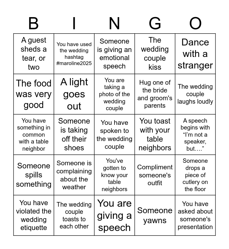This bingo card has 25 words: Someone spills something, The wedding couple toasts to each other, You have spoken to the wedding couple, Someone yawns, Dance with a stranger, A guest sheds a tear, or two, You have used the wedding hashtag #maroline2025, Someone is giving an emotional speech, You toast with your table neighbors, Someone drops a piece of cutlery on the floor, The food was very good, A light goes out, You are giving a speech, Compliment someone's outfit, The wedding couple laughs loudly, You have violated the wedding etiquette, Someone is taking off their shoes, You are taking a photo of the wedding couple, Hug one of the bride and groom's parents, A speech begins with “I’m not a speaker, but….”, You have something in common with a table neighbor, Someone is complaining about the weather, You've gotten to know your table neighbors, The wedding couple kiss and You have asked about someone's presentation.