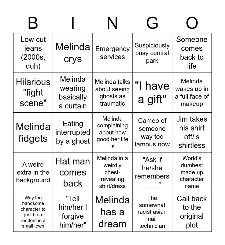 This bingo card has 35 words: "You can see me?", Almost getting into a vehicle accident, Turning around jumpscare by ghost, Melinda wearing basically a curtain, Melinda in a weirdly chest-revealing shirt/dress, Suspiciously busy central park, Hilarious "fight scene", Ghost passing through physical things, Melinda talks about seeing ghosts as traumatic, Professional Malpractice, Melinda fidgets, Someone comes back to life, "Leave me/us alone!", LoNG nECk Like an outfit that shows the enormity of it, Low cut jeans (2000s, duh), Cameo of someone way too famous now, The somewhat racist asian nail technician, Eating interrupted by a ghost, A weird extra in the background, Melinda complaining about how good her life is, "Ask if he/she remembers ____", Way too handsome character to just be a random in a small town, World's dumbest made up character name, "Tell him/her I forgive him/her", Emergency services, Melinda wakes up in a full face of makeup, Call back to the original plot, Eli makes a self depreciating joke, "I have a gift", Jim takes his shirt off/is shirtless, Melinda almost dies, Melinda has a dream, Hat man comes back, Melinda crys and Melinda looking crazy while talking to a ghost in public.