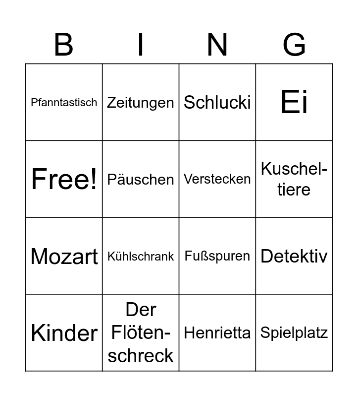 This bingo card has 16 words: Der Flöten-schreck, Detektiv, Schlucki, Pfanntastisch, Mozart, Zeitungen, Fußspuren, Henrietta, Free!, Päuschen, Kinder, Ei, Kühlschrank, Kuschel-tiere, Verstecken and Spielplatz.