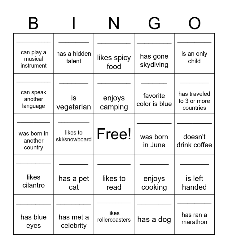 This bingo card has a free space and 24 words: _______ has a pet cat, _________ has met a celebrity, ________ enjoys camping, _________ has blue eyes, __________ is an only child, ___________ can play a musical instrument, ___________ can speak another language, _________ has a hidden talent, _________ was born in June, ________ likes to read, _______ favorite color is blue, __________ was born in another country, _______ enjoys cooking, _______ is left handed, _______ is vegetarian, ________ has a dog, _________ doesn't drink coffee, ________ likes spicy food, _________ has traveled to 3 or more countries, __________ likes to ski/snowboard, __________ has ran a marathon, _________ likes cilantro, _________ has gone skydiving and ___________ likes rollercoasters.