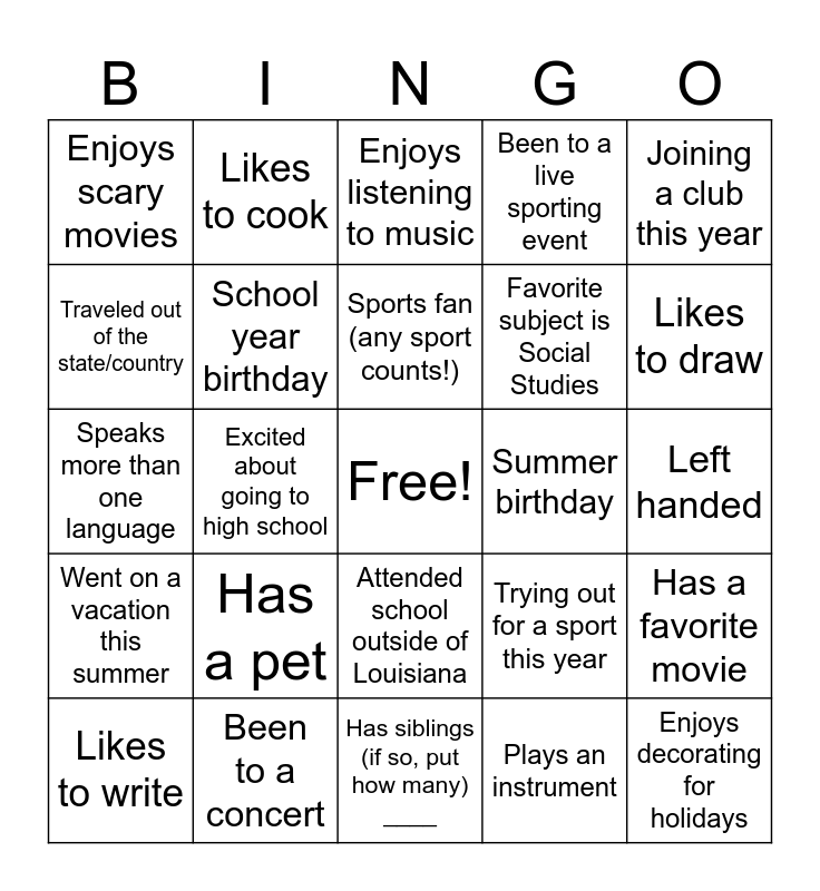 This bingo card has a free space and 24 words: Has a pet, Been to a concert, Sports fan (any sport counts!), Likes to write, Joining a club this year, Enjoys scary movies, Traveled out of the state/country, Likes to cook, Summer birthday, Attended school outside of Louisiana, Favorite subject is Social Studies, Speaks more than one language, Trying out for a sport this year, Has a favorite movie, School year birthday, Plays an instrument, Left handed, Enjoys listening to music, Likes to draw, Excited about going to high school, Enjoys decorating for holidays, Went on a vacation this summer, Been to a live sporting event and Has siblings (if so, put how many) ____.