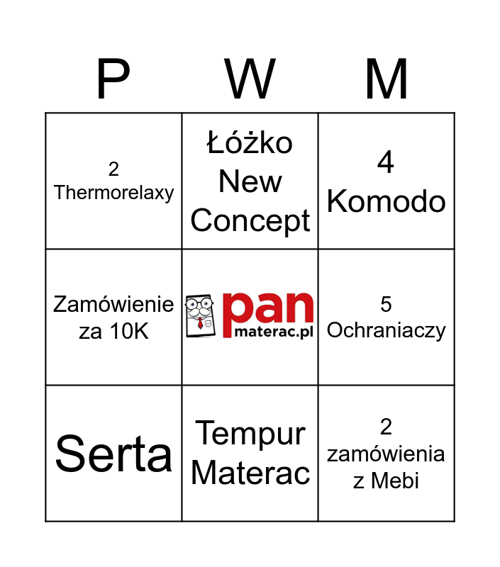 This bingo card has a free space and 8 words: 5 Ochraniaczy, 4 Komodo, Łóżko New Concept, Serta, 2 Thermorelaxy, 2 zamówienia z Mebi, Zamówienie za 10K and Tempur Materac.