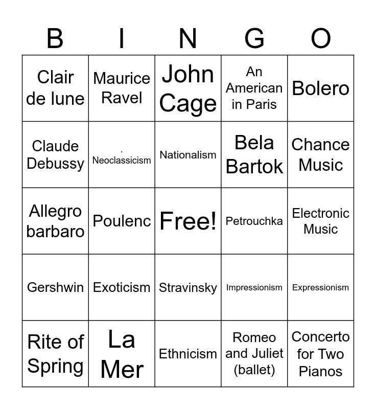 This bingo card has a free space and 25 words: Exoticism, Ethnicism, Nationalism, Rite of Spring, Bolero, Clair de lune, Claude Debussy, Maurice Ravel, Petrouchka, Stravinsky, Bela Bartok, Allegro barbaro, Impressionism, Expressionism, . Neoclassicism, Avant Garde, Electronic Music, John Cage, Chance Music, Poulenc, Concerto for Two Pianos, La Mer, Gershwin, An American in Paris and Romeo and Juliet (ballet).