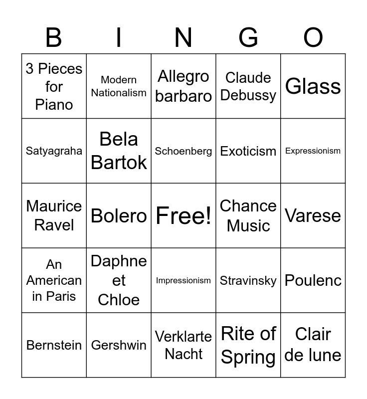 This bingo card has a free space and 25 words: Daphne et Chloe, Verklarte Nacht, Schoenberg, Bernstein, Glass, 3 Pieces for Piano, Satyagraha, Modern Nationalism, Chance Music, Impressionism, Exoticism, Maurice Ravel, Stravinsky, Poulenc, Bela Bartok, John Cage, Varese, Allegro barbaro, Expressionism, Bolero, Clair de lune, Gershwin, An American in Paris, Claude Debussy and Rite of Spring.