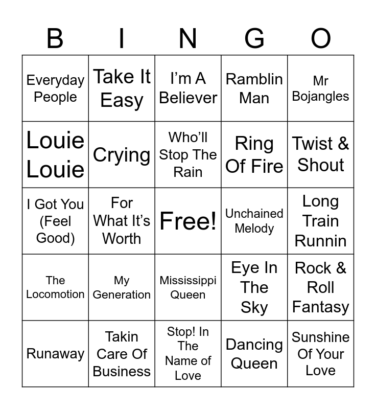 This bingo card has a free space and 84 words: Sugar Sugar, Brown Eyed Girl, I’m A Believer, Good Vibrations, Sweet Caroline, It’s Not Unusual, You Can’t Hurry Love, I Got You Babe, The Twist, Stuck On You, Itsy Bitsy Teenie Weenie Yellow Polka Dot Binkini, What A Wonderful World, Crying, Unchained Melody, Son Of A Preacher Man, Everyday People, Runaway, Louie Louie, You Really Got Me, Suspicious Minds, Born To Be Wild, Ring Of Fire, Sunshine Of Your Love, Light My Fire, For What It’s Worth, California Dreamin, I Want You Back, Fortunate Son, I Heard It Through The Grapevine, Sittin On The Dock Of The Bay, My Generation, Be My Baby, My Girl, I Got You (Feel Good), I Can’t Get No Satisfaction, Mr Tamborine Man, Stop! In The Name of Love, Oh, Pretty Woman, Twist & Shout, The Locomotion, Papa’s Got A Brand New Bag, Surfin USA, Spirit In The Sky, It’s My Party, Turn Turn Turn, Brandy (You’re A Fine Girl), Take It Easy, Go Your Own Way, Listen To The Music, Wheel In The Sky, Heat Of The Moment, Eye In The Sky, Ramblin Man, Ventura Highway, Don’t Fear The Reaper, Main Street, Takin Care Of Business, Who’ll Stop The Rain, Rich Girl, Long Train Runnin, Rocket Man, Cold As Ice, Doctor My Eyes, Carry On Wayward Son, Black Dog, Show Me The Way, Give A Little Bit, Radar Love, Mr Bojangles, Sister Golden Hair, Rock & Roll Fantasy, Come & Get It, I Want You To Want Me, Don’t Go Breaking My Heart, Mississippi Queen, Dancing Queen, Love Will Keep Us Together, Hotel California, Fly Like An Eagle, Jungle Love, Flirtin With Disaster, Come Together, Bohemian Rhapsody and Play That Funky Music.