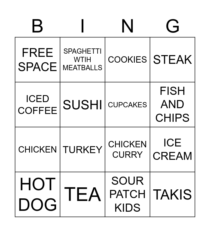 This bingo card has 16 words: HOT DOG, TEA, COOKIES, STEAK, ICED COFFEE, SPAGHETTI WTIH MEATBALLS, CHICKEN CURRY, ICE CREAM, FREE SPACE, SUSHI, SOUR PATCH KIDS, FISH AND CHIPS, CHICKEN, TURKEY, CUPCAKES and TAKIS.