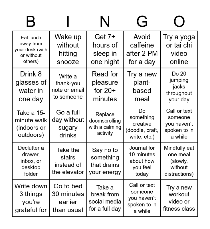 This bingo card has 51 words: Attend a group wellness activity (online or in person), Replace doomscrolling with a calming activity, Pack a lunch instead of ordering takeout, Take a break from social media for a full day, Take the stairs instead of the elevator, Meditate for 5+ minutes (guided or unguided), Wake up without hitting snooze, Compliment a coworker or friend, Drink 8 glasses of water in one day, Share a wellness tip or resource with a colleague, Write a thank-you note or email to someone, Avoid caffeine after 2 PM for a day, Mindfully eat one meal (slowly, without distractions), Journal for 10 minutes about how you feel today, Try a breathing exercise (box breathing, 4-7-8, etc.), Make your bed first thing in the morning, Read for pleasure for 20+ minutes, Do something creative (doodle, craft, write, etc.), Do 10 pushups (or a modified version), Try a yoga or tai chi video online, Go a full day without sugary drinks, Call or text someone you haven’t spoken to in a while, Eat lunch away from your desk (with or without others), Try a new plant-based meal, Dance to your favorite song, Try a new workout video or fitness class, Do 20 jumping jacks throughout your day, Try a new herb or spice in your cooking, Write down 3 things you're grateful for, Get 7+ hours of sleep in one night, Spend 15 minutes outside with no distractions, Unplug for one evening and spend it with loved ones, Eat a meal without multitasking or screens, Walk or bike to a destination instead of driving, Hold a plank for 30 seconds or more, Go to bed 30 minutes earlier than usual, Try a screen-free hour before bed, Say no to something that drains your energy, Ask someone how they're really doing—and listen, Prep a healthy snack instead of grabbing one, Call or text someone you haven’t spoken to in a while, Declutter a drawer, inbox, or desktop folder, Avoid processed foods for one full day, Do a short guided sleep meditation, Set up a calming nighttime routine, Do a random act of kindness, Take a 15-minute walk (indoors or outdoors), Eat 3 different colors of fruits or veggies, Take a 10-minute power nap, Say no to something that drains your energy and Try a screen-free hour before bed.
