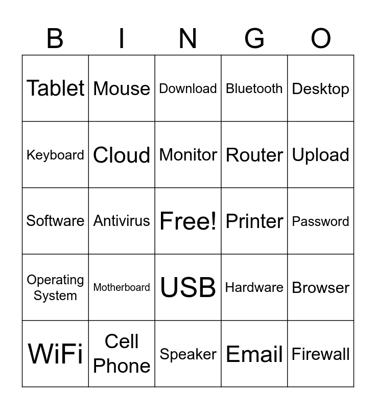 This bingo card has a free space and 24 words: Motherboard, Cell Phone, Monitor, WiFi, Desktop, Tablet, Keyboard, Mouse, Printer, USB, Router, Software, Hardware, Browser, Cloud, Email, Password, Download, Upload, Antivirus, Firewall, Operating System, Bluetooth and Speaker.