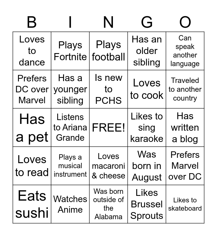 This bingo card has a free space and 33 words: Has played tennis, Has seen the new Fantastic 4 movie, Listens to Ariana Grande, Was born in February, Loves to read, Has a younger sibling, Can speak another language, Eats sushi, Plays Fortnite, Has ridden a horse, Is new to PCHS, Plays football, Loves to play video games, Has made a TikTok, Likes to sing karaoke, Traveled to another country, Watches Anime, Has a pet, Plays a musical instrument, Was born in August, Loves macaroni & cheese, Is an only child, Loves to dance, Has written a blog, Was born outside of the Alabama, Likes to skateboard, Has an older sibling, Loves to cook, Prefers DC over Marvel, Prefers Marvel over DC, Has or has had braces, Likes Brussel Sprouts and Listens to NBA YoungBoy.