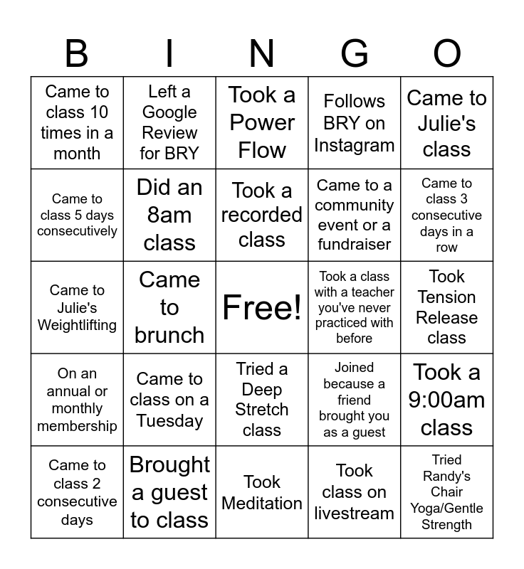 This bingo card has a free space and 24 words: Came to class on a Tuesday, Brought a guest to class, Took a recorded class, Came to class 2 consecutive days, Came to Julie's class, Came to class 10 times in a month, Came to class 5 days consecutively, Left a Google Review for BRY, Took a class with a teacher you've never practiced with before, Tried a Deep Stretch class, Came to a community event or a fundraiser, Came to Julie's Weightlifting, Joined because a friend brought you as a guest, Took a 9:00am class, Did an 8am class, Took class on livestream, Took Tension Release class, Took a Power Flow, Came to class 3 consecutive days in a row, Came to brunch, Tried Randy's Chair Yoga/Gentle Strength, On an annual or monthly membership, Follows BRY on Instagram and Took Meditation.