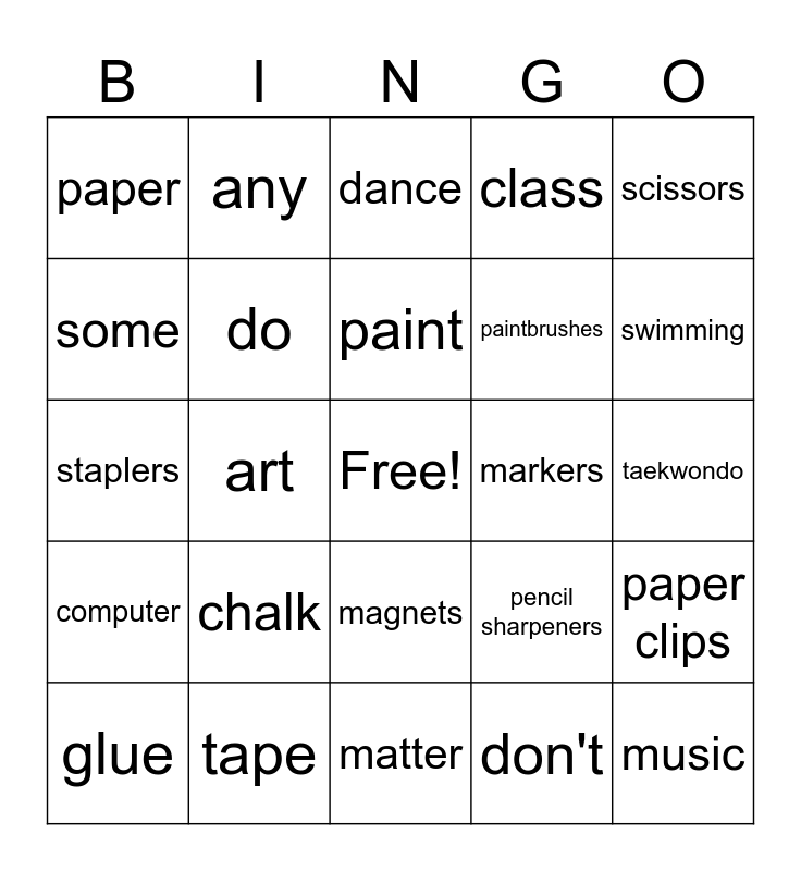 This bingo card has a free space and 24 words: chalk, tape, paint, glue, scissors, paper, some, any, markers, magnets, paintbrushes, staplers, pencil sharpeners, paper clips, do, don't, taekwondo, dance, swimming, art, music, computer, class and matter.