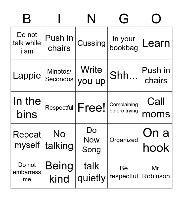 This bingo card has a free space and 24 words: No talking, Being kind, Write you up, Do not embarrass me, Learn, Do not talk while i am, Lappie, Push in chairs, Complaining before trying, Do Now Song, Shh..., In the bins, Organized, On a hook, Minotos/ Secondos, Be respectful, Call moms, Cussing, Push in chairs, Respectful, Mr. Robinson, Repeat myself, In your bookbag and talk quietly.