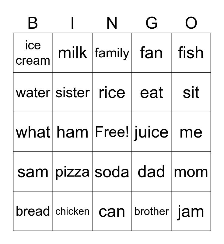 This bingo card has a free space and 24 words: pizza, chicken, rice, bread, fish, ice cream, water, milk, juice, soda, eat, what, dad, mom, sister, brother, me, family, sit, ham, jam, sam, fan and can.
