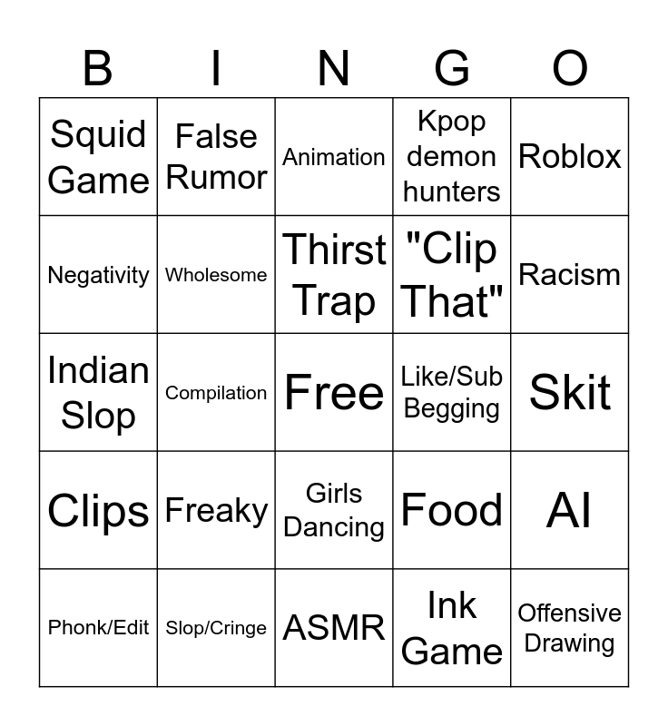 This bingo card has a free space and 24 words: Freaky, Slop/Cringe, Thirst Trap, Phonk/Edit, Roblox, Squid Game, Negativity, False Rumor, Like/Sub Begging, Girls Dancing, "Clip That", Indian Slop, Food, AI, Wholesome, Ink Game, Skit, Animation, Racism, Compilation, Offensive Drawing, Clips, Kpop demon hunters and ASMR.