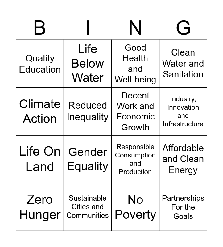 This bingo card has 17 words: No Poverty, Zero Hunger, Good Health and Well‑being, Quality Education, Gender Equality, Clean Water and Sanitation, Affordable and Clean Energy, Decent Work and Economic Growth, Industry, Innovation and Infrastructure, Reduced Inequality, Sustainable Cities and Communities, Responsible Consumption and Production, Climate Action, Life Below Water, Life On Land, Peace, Justice and Strong Institutions and Partnerships For the Goals.