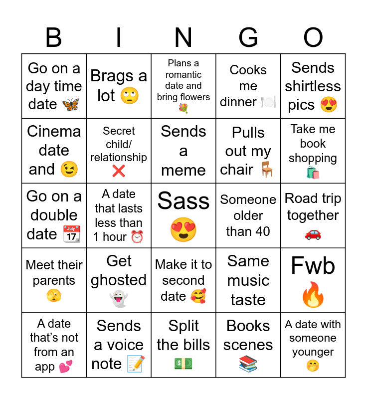 This bingo card has a free space and 24 words: Get ghosted π», Sends a voice note π, Sends a meme, A date thatβs not from an app π, Sends shirtless pics π, Go on a day time date π¦, Cinema date and π, Brags a lot π, Someone older than 40, Make it to second date π₯°, Pulls out my chair πͺ, Go on a double date π, Same music taste, Fwb π₯, Secret child/ relationship β, Books scenes π, Road trip together π, Plans a romantic date and bring flowers π, Take me book shopping ποΈ, A date that lasts less than 1 hour β°, A date with someone younger π€, Meet their parents π«£, Cooks me dinner π½οΈ and Split the bills π΅.