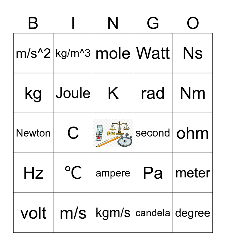 This bingo card has a free space and 24 words: volt, ℃, K, candela, Ns, m/s^2, kg/m^3, mole, second, ohm, Newton, Joule, Pa, meter, kg, m/s, kgm/s, Watt, Nm, Hz, C, ampere, rad and degree.